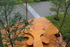 これは、平成22年に岐阜市「つかさのまち夢プロジェクト」の競技設計が行われ、70の案の中から伊東豊雄氏(建築)、石川幹子(ランドスケープ)の案が最優秀となったもので、5年の歳月をかけ、図書館と広場、延長250mに及ぶ、6列のカツラ並木と”せせらぎ”が整備され、岐阜市民の憩いと創造の拠点が創り出されました。